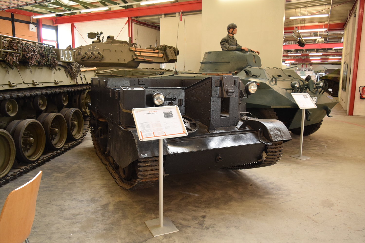 ドイツ・ムンスター戦車博物館に展示されるブレンガンキャリアは、Universal Carrier Mk.III型に分類される保存車輌である。これは終戦後に西側諸国で使用された後期型で、補助装甲板と改良型サスペンションを備える。博物館においては、重戦車群の中にあえてこの軽装甲車輌を配置することで、「装甲戦の裏にある支援システム」を提示している点が興味深い。研究者にとっては、構造的シンプルさと設計思想の対比を実車で確認できる貴重な資料である。