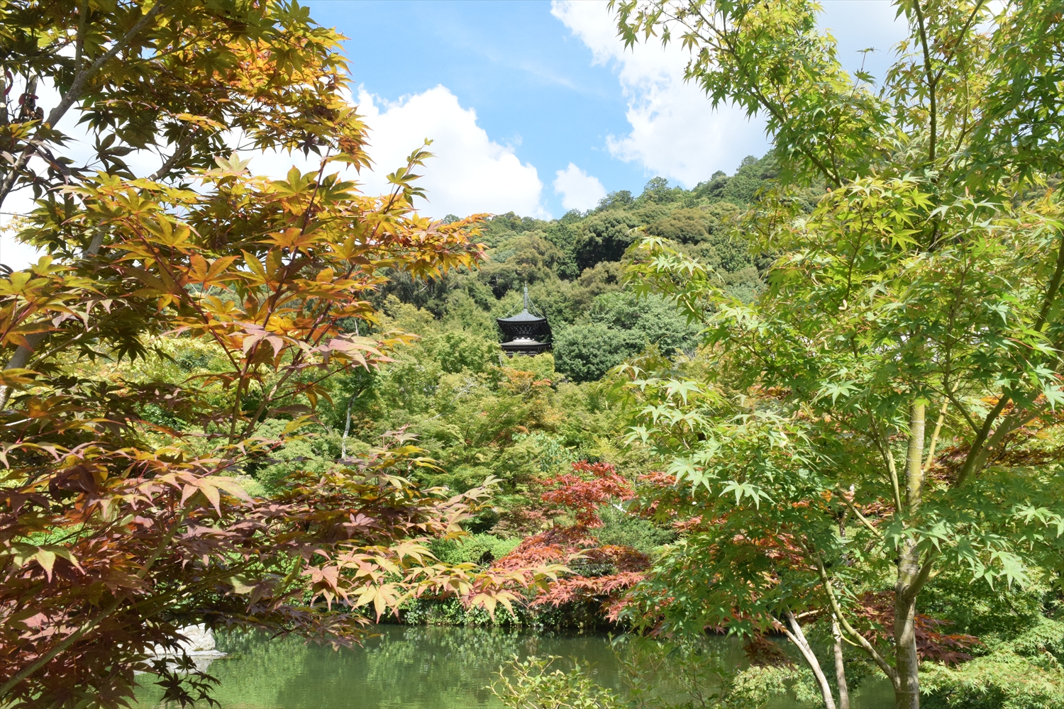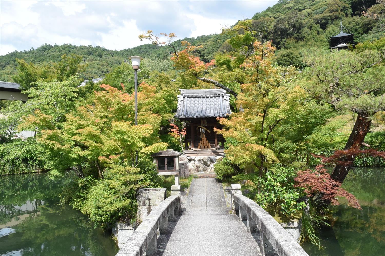 放生池は単なる池ではなく、禅林寺の庭園全体の中心軸を成す存在です。池を取り囲むように中門、御廟、多宝塔、そして極楽橋が配置されており、これらが一体となって風景を構成しています。多宝塔の朱色が紅葉と重なり合い、池に映る様はまさに絵巻物のよう。庭園設計としても高度な構成力が見られ、池の位置や視線の抜け方に、平安貴族の美意識が息づいています。