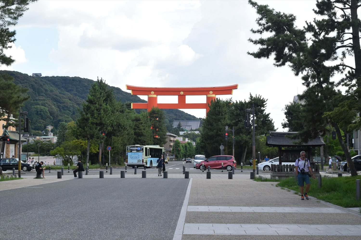 平安神宮の大鳥居は24.2mの高さを誇り、京都のランドマークとして非常に有名です。その姿はまさに圧巻で、岡崎エリアを象徴する風景として多くの観光客に愛されています。大鳥居は本殿への入口であるだけでなく、「平安京の世界へ足を踏み入れる象徴」として設計されました。車道をまたぐように建つその姿は迫力満点で、初めて見る人はその大きさに驚くでしょう。また、この朱色の鳥居は遠くからでも見えるため、観光の目印としても役立ちます。まさに京都観光のスタート地点としてふさわしい存在です。