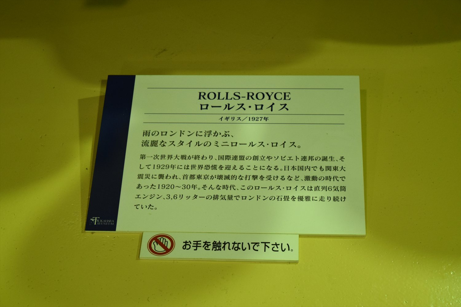 また、説明文には、第一次世界大戦後の国際情勢や1920〜30年代の激動の時代背景に触れつつ、この車がロンドンの石畳を優雅に走り続けたことが述べられている。
