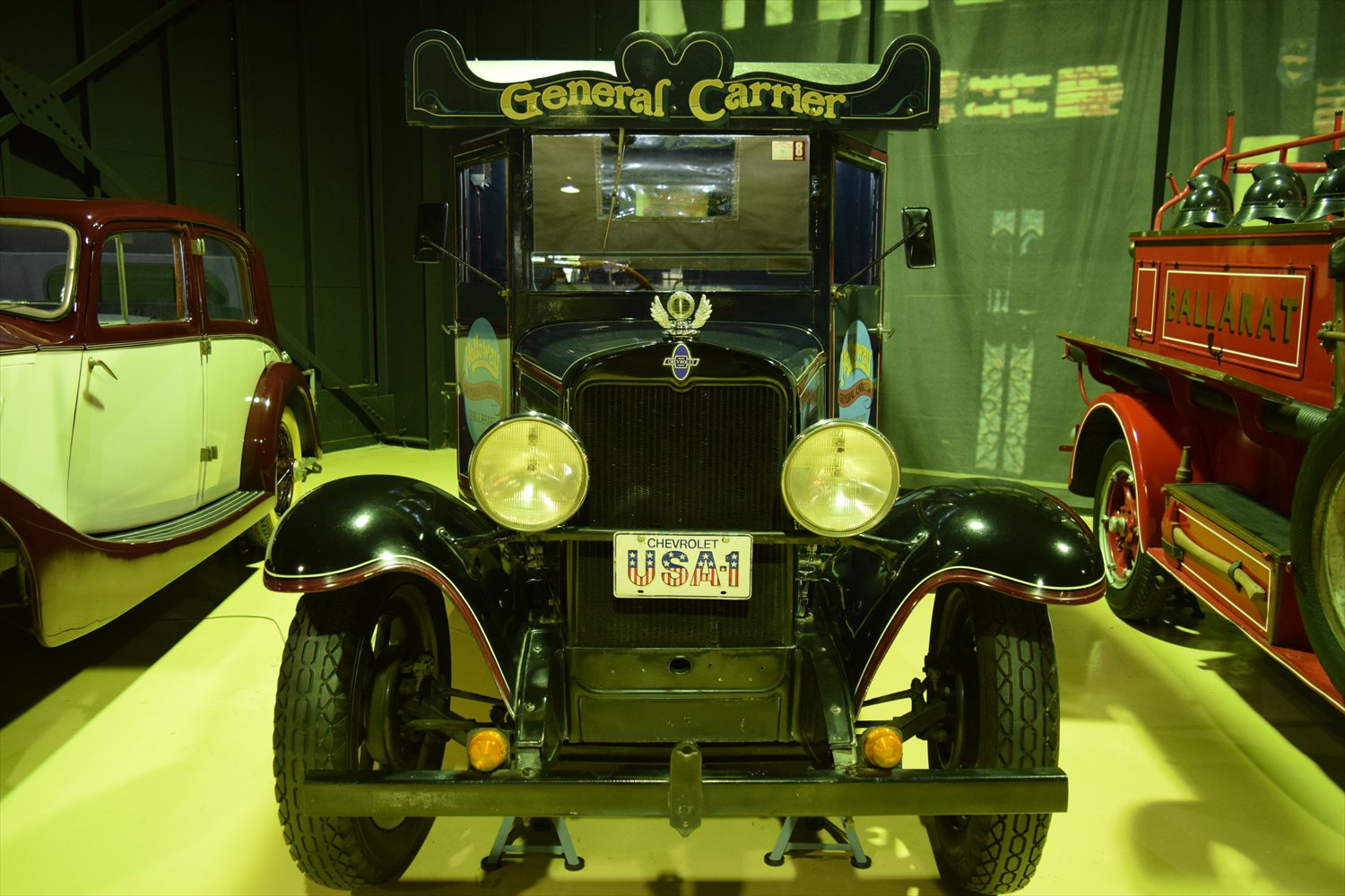 車両の側面には「Holloway General Carrier Ballarat」という文字が記されており、これはオーストラリア・ビクトリア州の都市「バララット(Ballarat)」で実際に使用されていた業務用車両であることを示唆しています。ナンバープレートの「USA-1」はアメリカ製であることを強調する演出であり、オリジナル性の高さを示します。