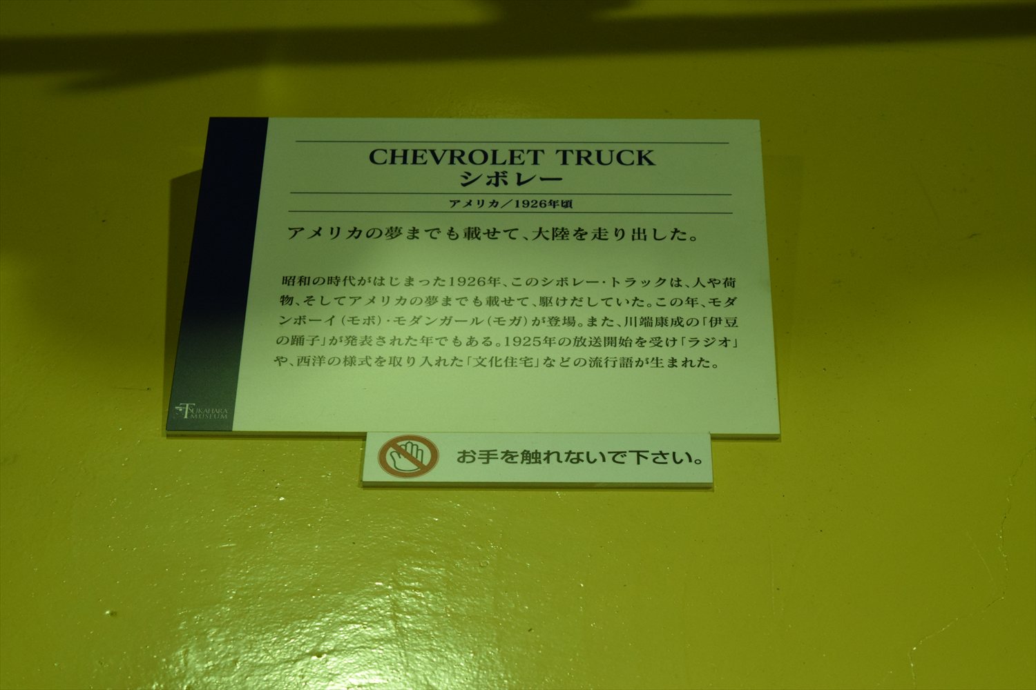 展示パネルによると、この車両は「CHEVROLET TRUCK(1926年頃)」とされており、国はアメリカ、用途は貨物輸送車です。パネルには「アメリカの夢までも載せて、大陸を走り出した。」という一文が添えられており、1920年代当時の社会的・文化的背景にまで思いを馳せることができます。