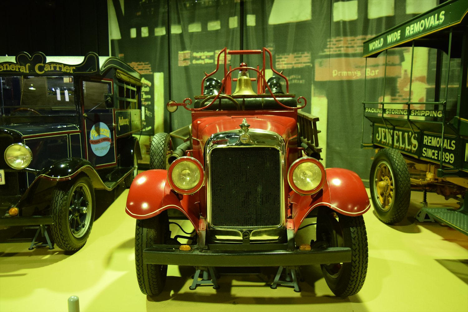 ダッジ23HPは、1926年にアメリカで製造された自動車をベースとする消防車である。車名にある「23HP」は当時の馬力基準を示し、消防用途として十分な動力性能を備えていた。展示されている車両には赤色の車体、車上の警鐘(ベル)、消防用に架装された構造が確認でき、実際に火災現場で使用されていた実戦用消防車であったことが分かる。排気量は3478.96ccとされ、重い消防装備を積載した状態でも安定した走行が可能だった。